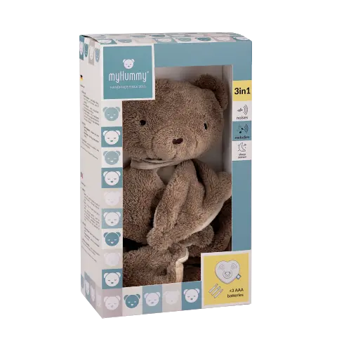 myHummy Doudou Ourson associe la tendresse d’un doudou tout doux avec une couverture câline et la technologie d’un cœur sonore qui accompagne bébé vers un sommeil paisible dès la naissance. Les sons diffusés rappellent au nouveau-né le bruit rassurant entendu dans le ventre de maman, favorisant la détente, la sécurité et un endormissement naturel. Cet ourson deviendra rapidement le premier compagnon de votre enfant, à la fois pour dormir et pour jouer.